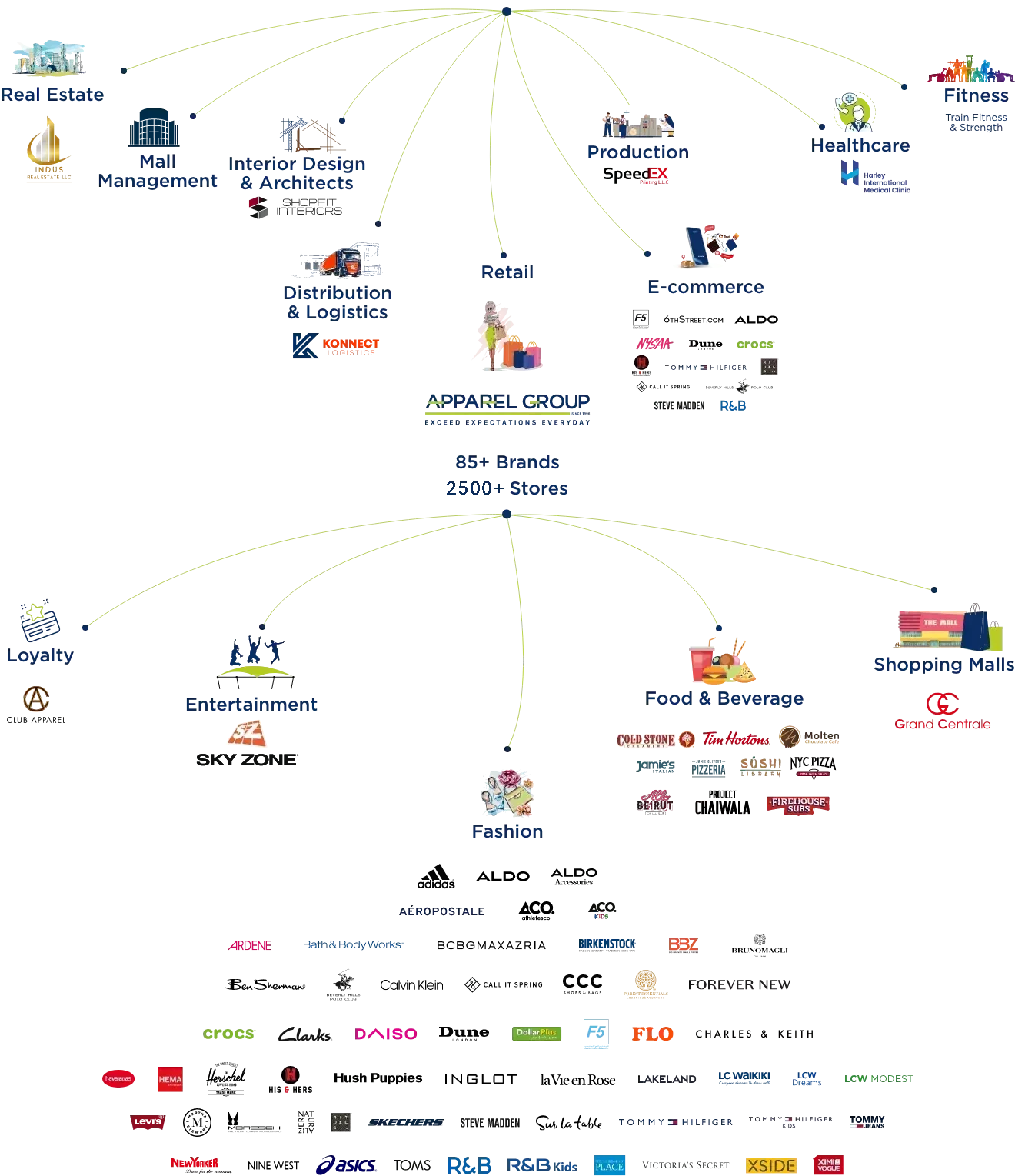 Apparel Group, a globally recognised name in the retail industry, is leading the forefront of our diverse portfolio. This flagship enterprise encompasses a network of more than 2500 stores worldwide, carrying over 85 distinct brands. Included under the Apparel Group’s umbrella are esteemed fashion, footwear, and lifestyle labels such as Tommy Hilfiger, Calvin Klein, SKECHERS, LC Waikiki, Charles & Keith, Levi’s, Birkenstock, TOMS, Forest Essentials, and more.